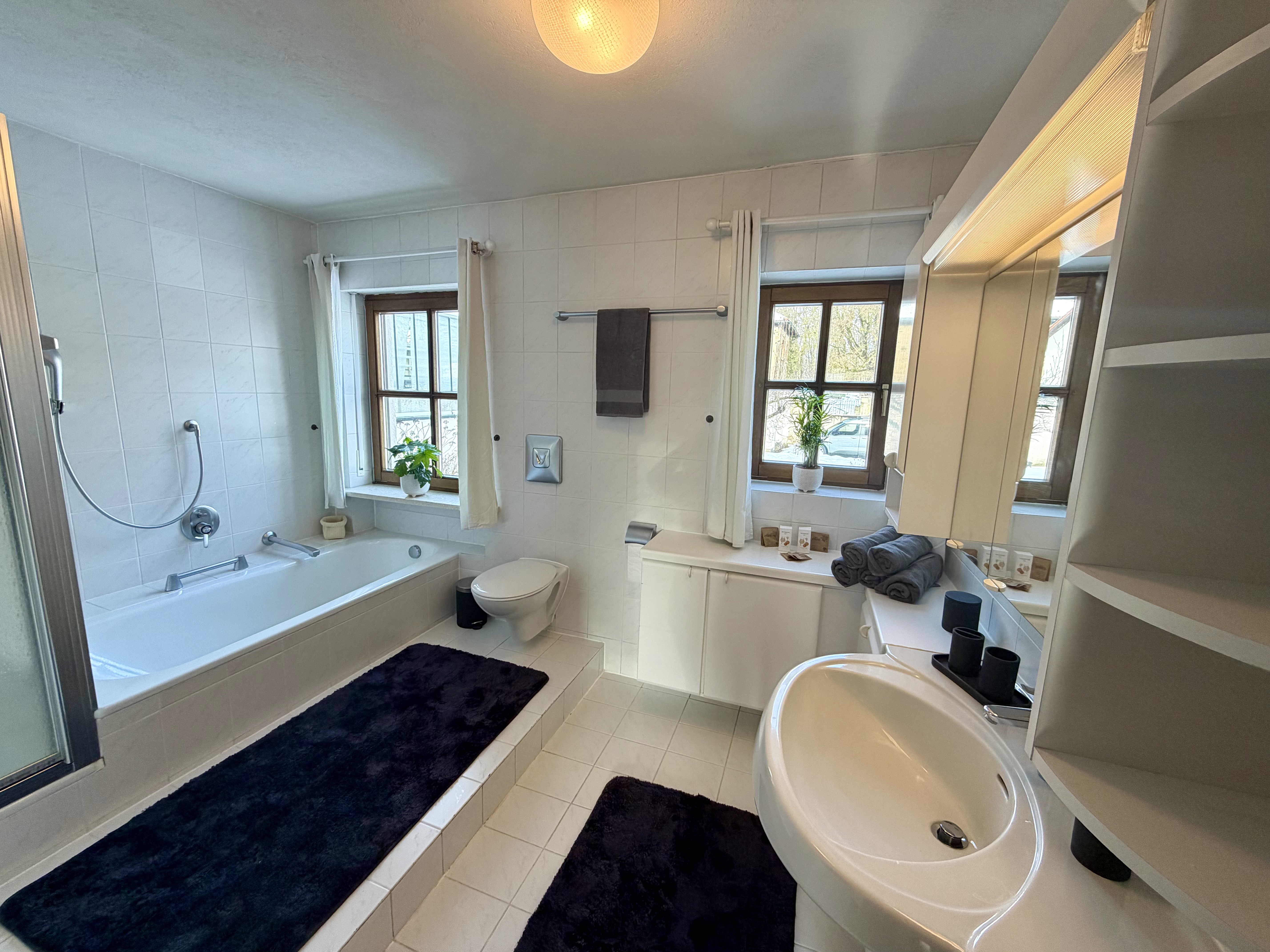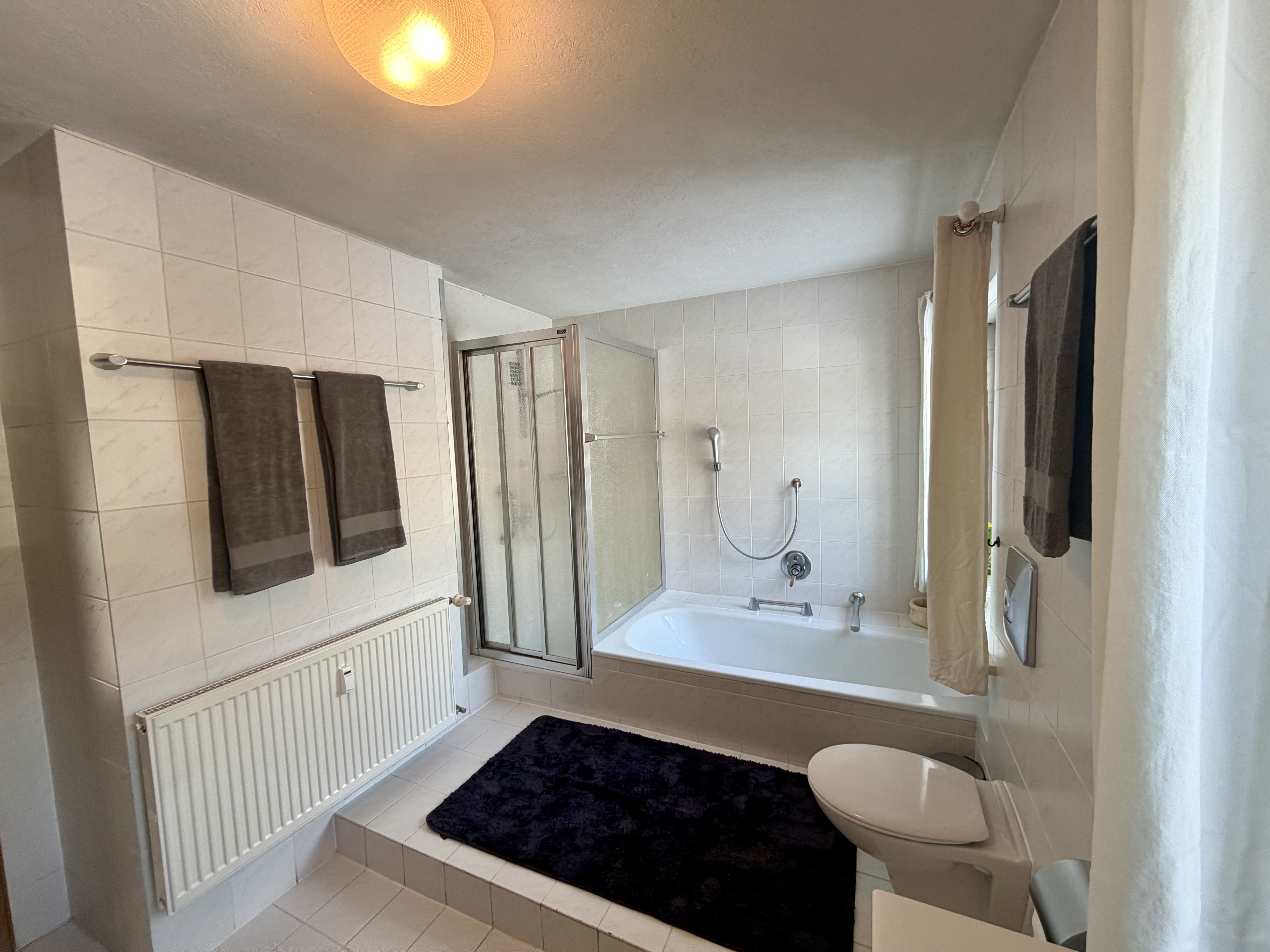 Das Badezimmer ist komfortabel ausgestattet mit Dusche und Badewanne – ideal für einen entspannten Start oder Ausklang des Tages.
